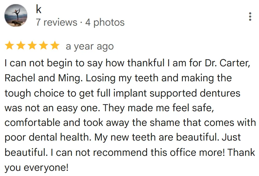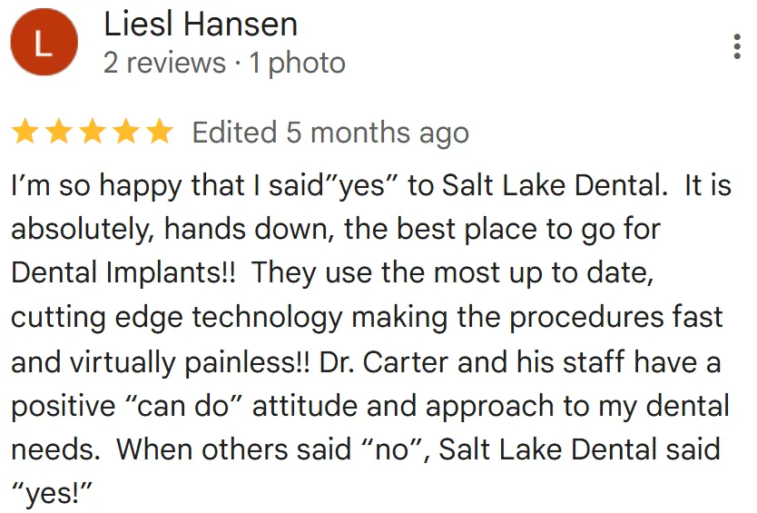 The number one thing that we hear from all of our patients is that dental implants have been life-changing. They are no longer embarrassed, they now have confidence to smile around their loved ones and co-workers and they can eat what they want.