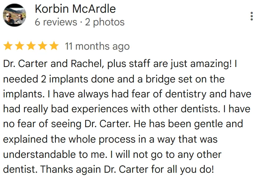 Patients appreciate Dr. Carter's warm and friendly demeanor, which creates a comfortable and trusting environment. Continually staying updated on the latest advancements, he ensures that his patients receive state-of-the-art implant solutions that yield lasting, natural-looking results. Dr. Tysen Carter's commitment to excellence and dedication to improving lives make him a respected and sought-after dental implant dentist.